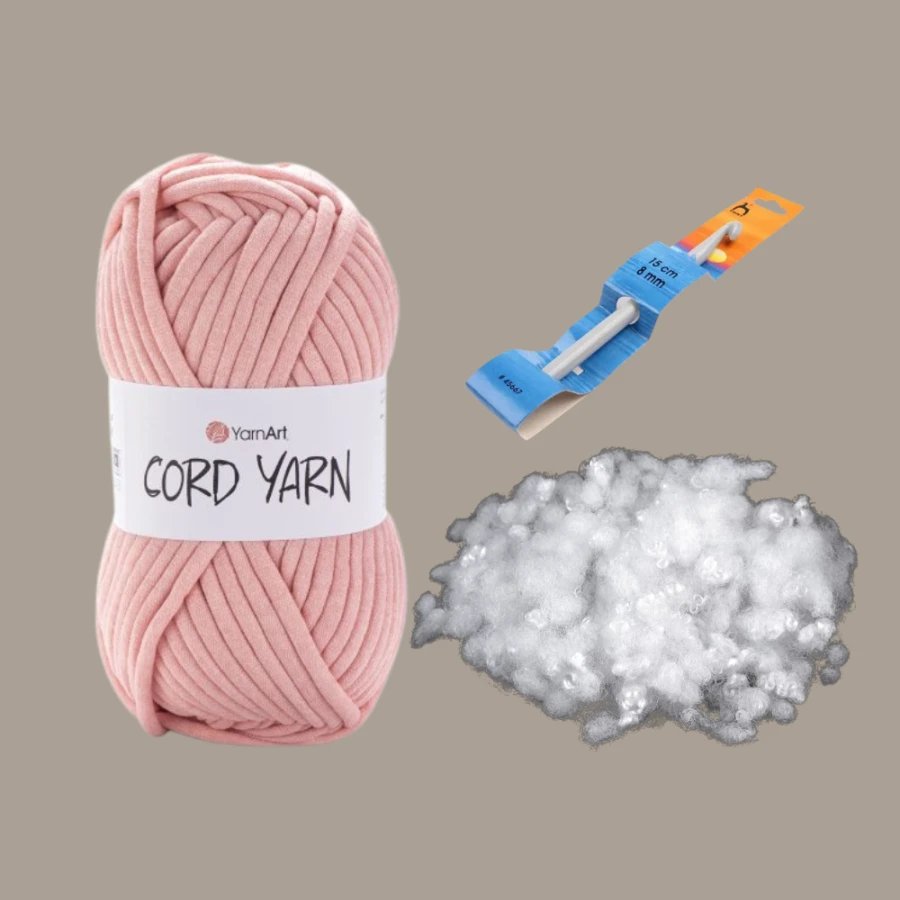 V sade máte pripravené : 1 klbko Cord Yarn podľa vášho výberu, 250 g antialergickej výplne, háčik 8 mm.